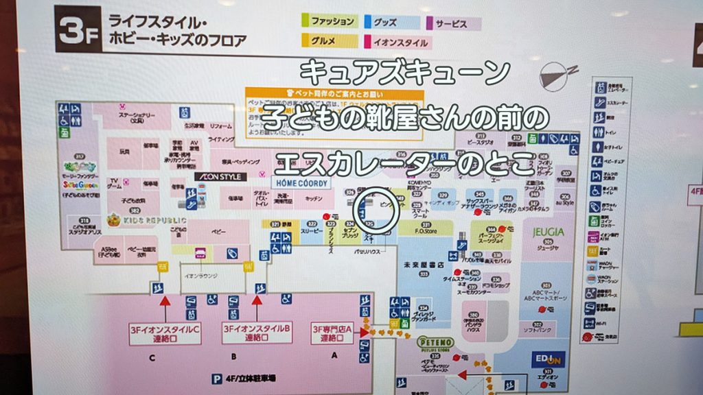 ●キュアズキューン:3F|ゲンキキッズ(靴屋)前のエスカレーター付近